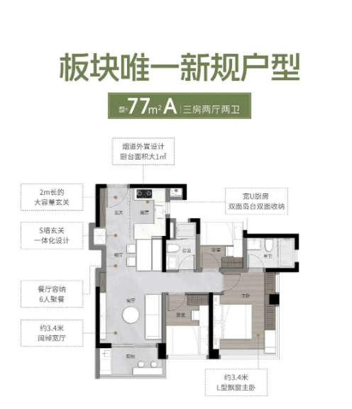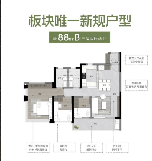 项目作为南站板块首个超新规产品,打造 77-135㎡三至四房户型,实测使用率高达 127-138%,阳台占比达 20%(板块最高),并设计 14 种变异户型,适配不同家庭需求。77㎡A 户型为 “三房两厅两卫”,三面宽南向,270° 全景舱主卧搭配 LDKB 一体化公区,紧凑面积内实现功能齐全;88㎡户型分 A、B 两款,A 户型配备约 4.7 米大阳台与 3.5×4.3 米双采光大主卧,B 户型则升级主卧步入式衣帽间,7.3 米通铺阳台连接次卧,空间延展性极强。