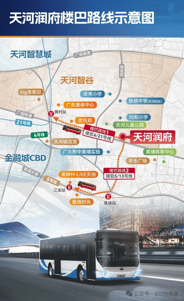 公共出行方面,项目周边 3 公里范围内覆盖多条地铁线路,包含 4 号线、5 号线、7 号线、13 号线四大轨道交通,虽然地铁直线距离存在一定距离,但项目针对性弥补轨交短板,创新推出五年免费楼巴服务,成为公共出行的核心加分项。两条固定楼巴路线常态化运营,路线一直达奥体优托邦商圈与黄村地铁站,衔接 4 号线、21 号线双地铁换乘;路线二直达鱼珠地铁站、美林天地商圈与三溪地铁站,串联 5 号线、13 号线轨道交通站点,定时定点发车,班次密集,极大降低了地铁接驳的出行成本。