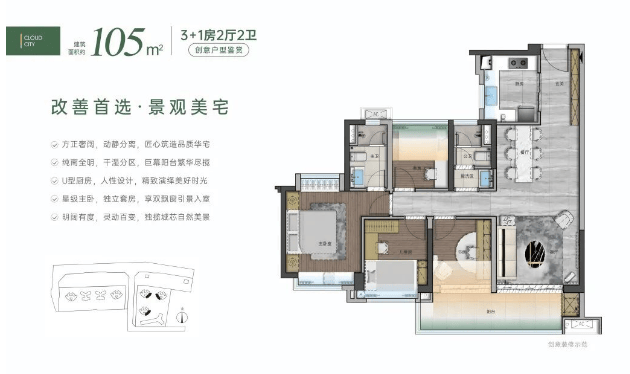 一期:72㎡、88㎡、105㎡的四房户型,交楼时间为2025年12月。
