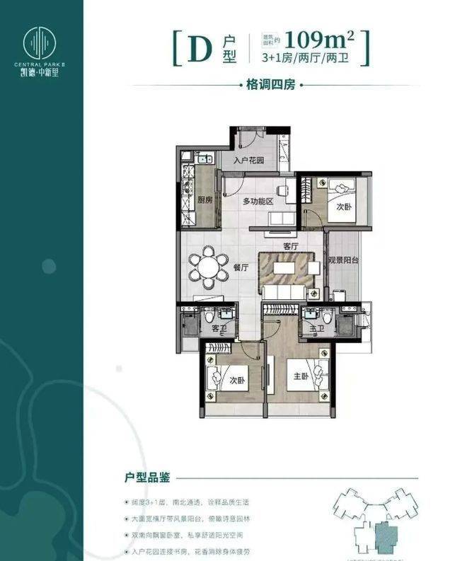 95 - 106 平的三房户型,动静分区明确,功能区布局合理。客厅与餐厅一体化设计,营造出宽敞大气的公共空间,适合家庭聚会与日常活动。三个卧室分布在一侧,保证了休息区的安静与私密。其中一间次卧可根据家庭需求灵活改造,如 109㎡户型可变为 3 + 1 房,作为书房、儿童房或是客房,满足家庭不同阶段的生活需求,为生活增添更多可能。