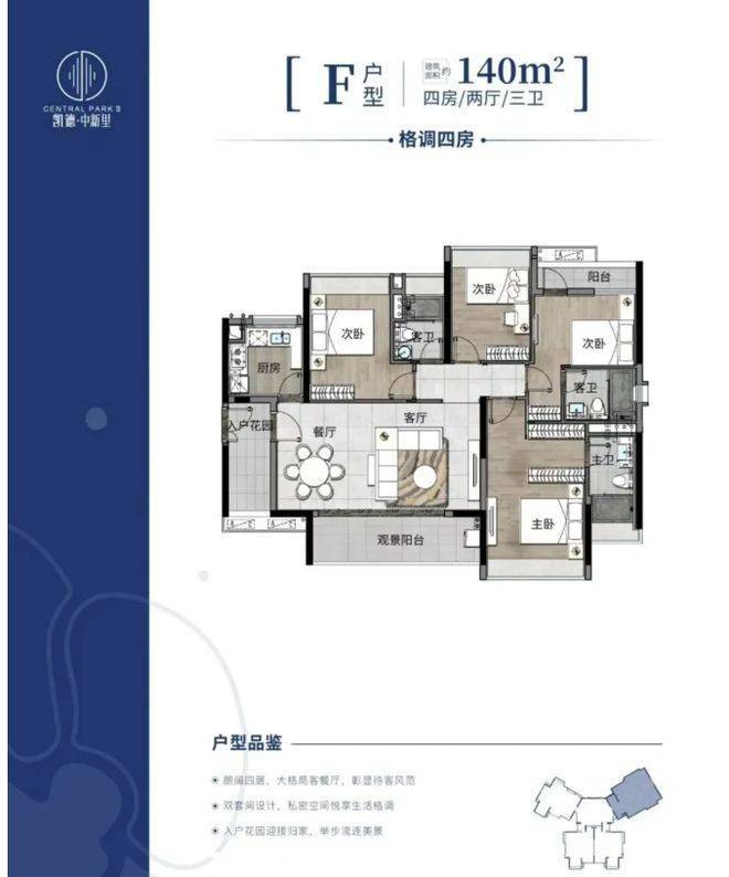 120 - 140 平的四房户型,空间布局开阔,尽显奢华与大气。四房两厅的设计,满足三代同堂或二胎家庭的居住需求。客厅连接大阳台,不仅增加了采光面,还为家庭提供了一个休闲观景的好去处,可俯瞰城市美景或园林风光。卧室设计注重舒适度与功能性,每个房间都拥有良好的采光与通风,尤其是主卧套房,配备独立的衣帽间和卫浴,提升居住的品质感与私密性,让您享受高品质的居住体验。