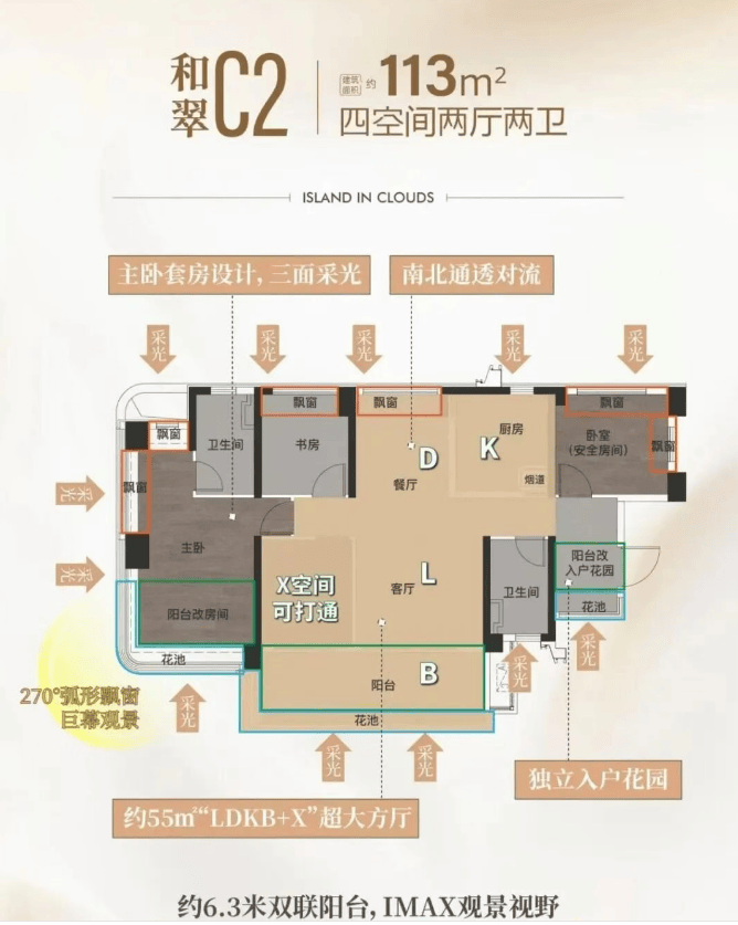 3. 113㎡四房两厅两卫(和翠户型):该户型为改善型主力户型,空间宽敞,布局合理,南北通透,采光通风俱佳,适合四口之家、三代同堂居住。客厅与餐厅相连,形成开阔的活动空间,连接南向景观阳台,视野开阔,可俯瞰社区7.2万㎡景观,闲暇时可欣赏美景、放松心情;主卧套房设计,朝南,配备独立卫生间、衣帽间和飘窗,空间宽敞舒适,私密性强,满足主人的居住尊崇感;三个次卧大小适中,采光充足,其中一个次卧可作为书房,满足办公、学习需求,另外两个次卧可作为儿童房、老人房,灵活适配不同家庭需求;厨房为U型设计,操作空间充足,连接生活阳台,便于储物和通风;公共卫生间干湿分离,设计合理,同时配备一个次卫,满足家人日常使用需求,避免早晚高峰期排队困扰。