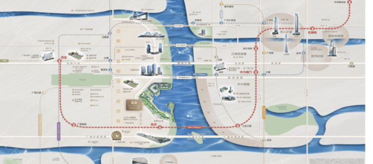 项目地处白鹅潭CBD东南角,临近珠江后航道,周边轨道交通资源丰富。现有地铁10号线东沙站近在咫尺,未来规划的10号线、11号线及22号线将进一步提升区域通达性,实现快速接驳全城主要商务及生活圈。自驾方面,项目毗邻环城高速与丫髻沙大桥,便捷连接主城区及海珠、天河等核心区,但高峰期交通车流较大,需要合理安排出行时间。区域内路网规划完善,未来片区道路将进一步改善,项目兼顾了安静的江景居住环境与城市核心的交通便利性,为居者提供静谧与繁华兼得的生活体验。
