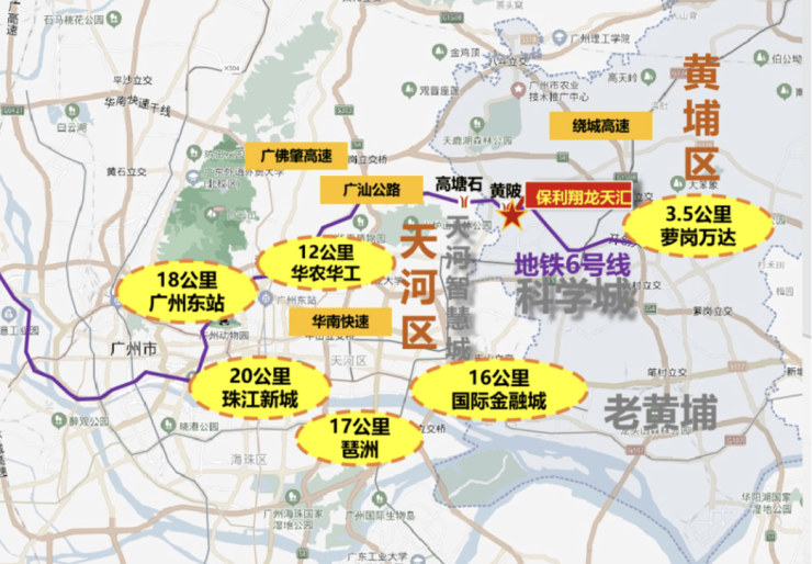 保利翔龙天汇山和墅坐落于黄埔科学城的核心区域,具体位于广汕路与开创大道交汇处,地处城市发展的黄金地带。这里不仅是黄埔区的政治、经济、文化中心,更是连接广州各区域的重要枢纽。