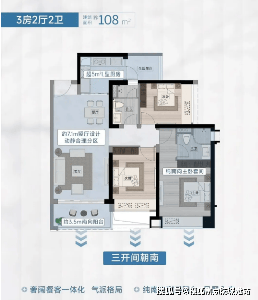 105㎡三房户型,适合刚需三口之家,户型方正、南北通透,客厅连接景观阳台,采光通风俱佳,能够最大限度地引入自然光线,让室内空间更加明亮通透;三个卧室均配备飘窗,增加使用空间的同时,也能欣赏社区美景;卫生间干湿分离设计,提升使用舒适度,避免潮湿困扰;厨房紧邻餐厅,动线合理,方便日常烹饪与用餐,满足刚需家庭的日常居住需求。