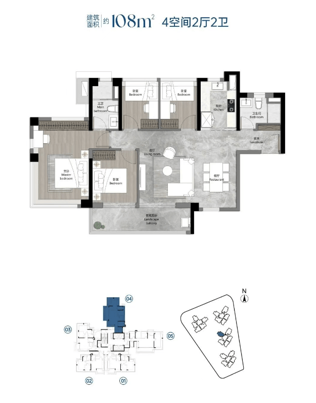 约120㎡四房两卫:南北对流,LDKB一体化设计,主卧拥有270°观景窗和步入式衣帽间。