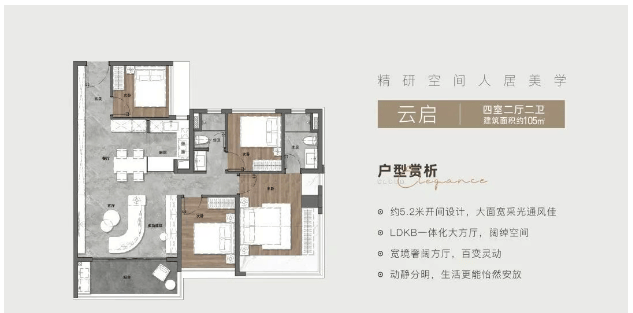 建面约105平方米:四房两厅两卫,适合家庭居住;