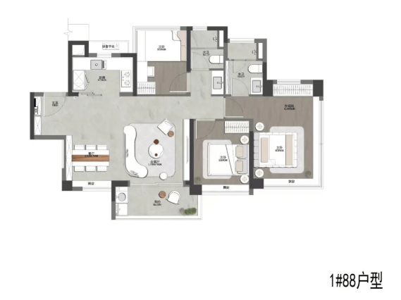 建面约84-88㎡三房两卫:紧凑而不失功能,适合年轻夫妇或三口之家,南向采光优越。