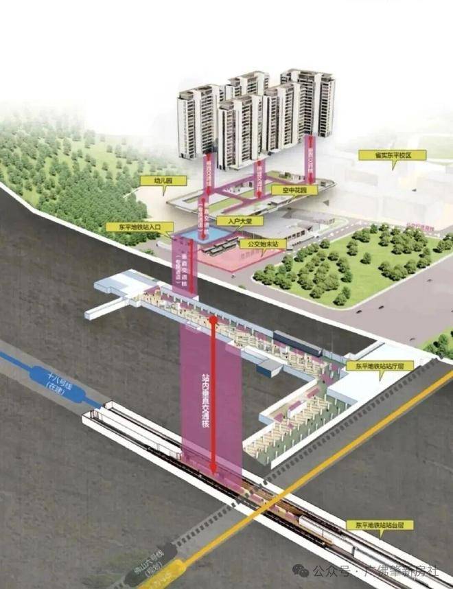 在建中的广花城际将联通18号线,进一步串联广州东站、琶洲、珠江新城、万博及南沙等核心商务板块,并延伸至湾区其他城市。未来佛山6号线规划对接白云东平板块,推动广佛一体化发展。多轨交汇格局,使项目具备区域级交通枢纽价值。