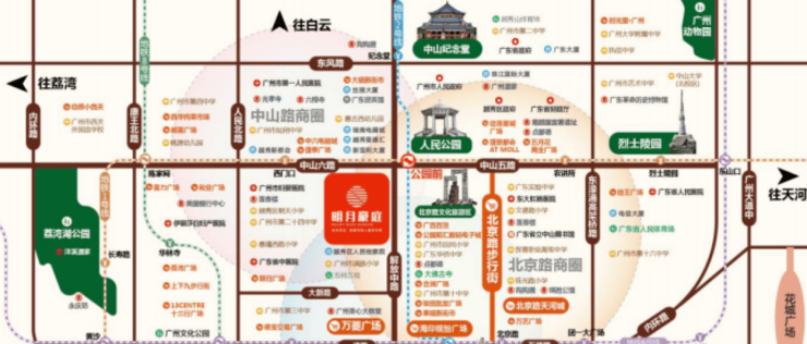商业配套的密集度直接决定生活便利度,明月豪庭真正实现了 “下楼即城”。步行 300 米即达北京路步行街,这里聚集了广百、天河城等大型商超,餐饮、购物、影院等消费场景全链条覆盖,年客流量超 1 亿的商圈活力为生活注入烟火气。