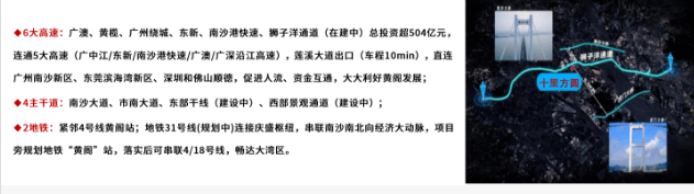 轨道交通层面,项目近邻地铁4号线黄阁站,快速接驳18号线、22号线等湾区高速地铁,18号线时速160km/h,3站直达珠江新城,通勤效率远超常规地铁。未来规划地铁线路贯穿板块,进一步提升轨道交通价值。
