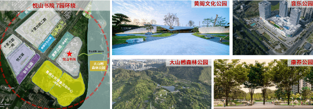 答:七大主题公园环绕,下楼直达大山乸森林公园,配建登山步道,日常休闲、登山、露营便捷无忧。