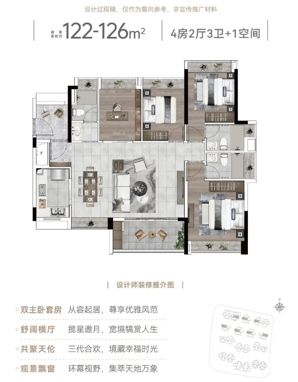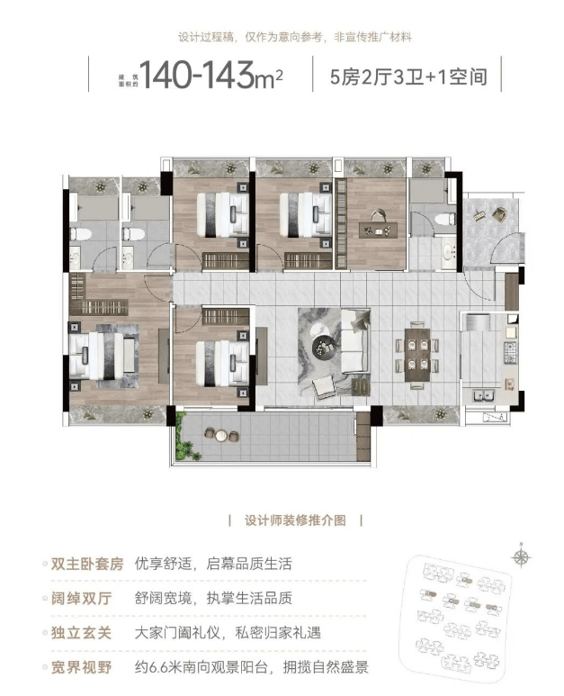 143㎡改善四房:奢阔主套、双阳台设计,满足多代同住需求。