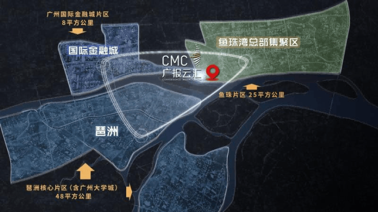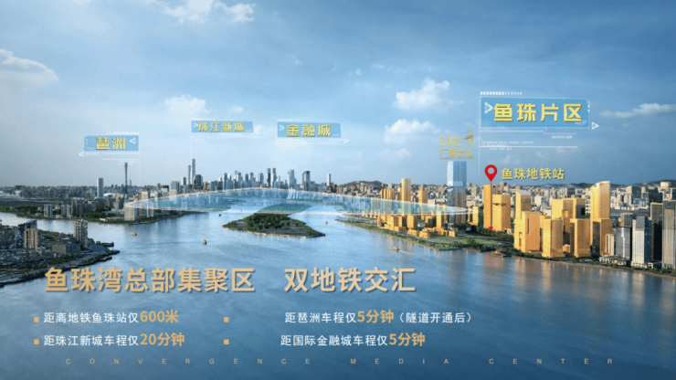 广报云汇所处的鱼珠湾总部集聚区,规划面积达 25 平方公里,占据珠江两岸经济带与港深珠澳科创走廊的黄金交汇处,未来将打造成为广州市乃至广东省的科技文化产业新高地。区域内已聚集航运、IAB 产业、5G、总部经济等一批高新产业,产业集群效应显著,为入驻企业提供了丰富的合作资源与发展机遇。