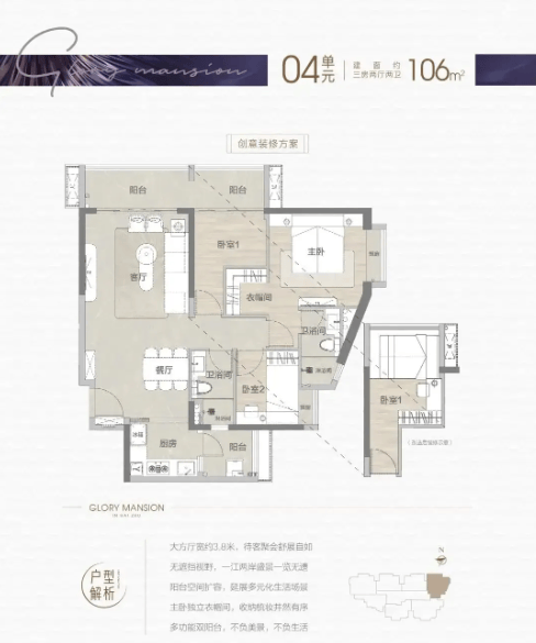 106㎡三房两卫:三口之家的改善优选。 总价约552万的106㎡户型,在空间尺度上有了质的飞跃。户型方正通透,动静分区合理,确保了家庭成员之间的互不干扰。主卧配备了独立卫浴,提升了居住的私密性与尊贵感。全屋收纳系统经过精心设计,可拓展出更多的储物空间,完美解决了家庭杂物收纳的难题。无论是孩子的玩具、书籍,还是换季的衣物、被褥,都能找到合适的归宿,让家始终保持整洁有序。