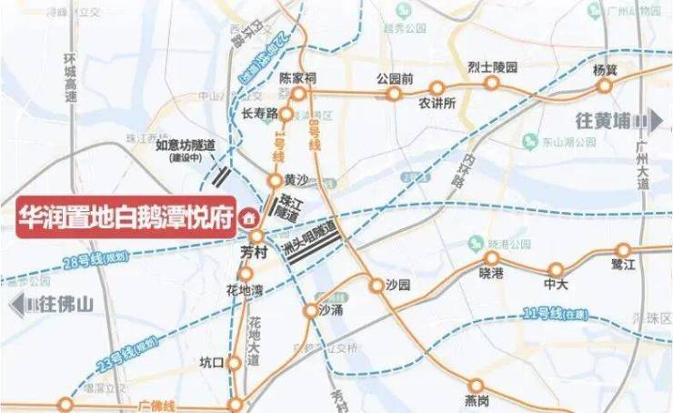 白鹅潭悦府距离地铁芳村站约400米,片区未来1号线、11/22号线(在建)、以及规划中的28号线等4条地铁交汇,业主可以直达越秀、天河、海珠,都算是非常便利。