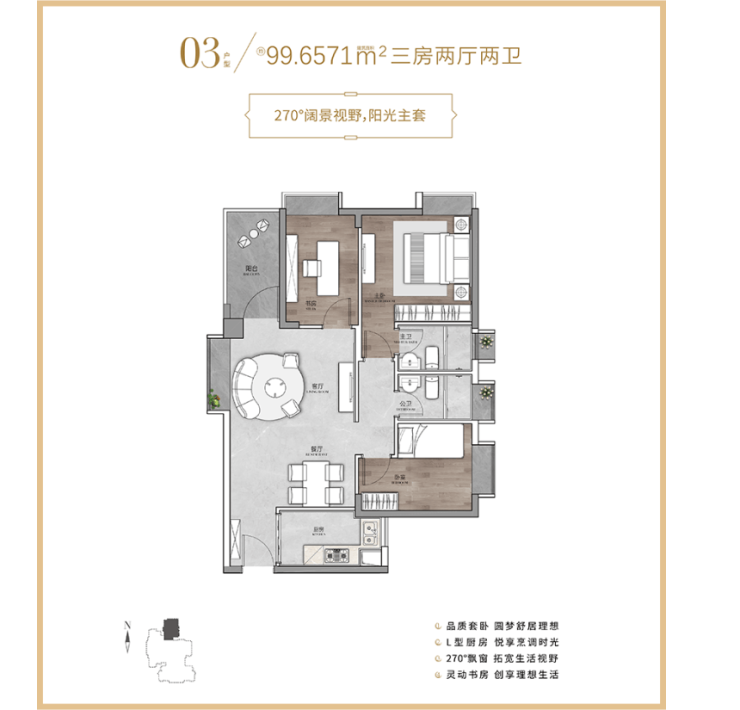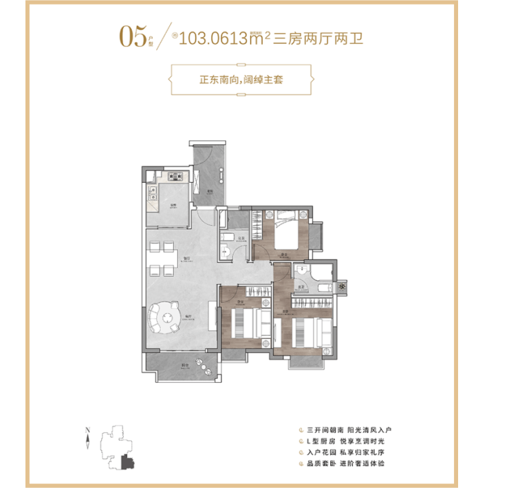 作为项目的主力大户型,103㎡三室两厅总价在336万-450万元之间,适合有老人同住的大家庭。该户型最大亮点是客厅面宽更宽,搭配超大阳台,采光通风效果极佳,部分高楼层房源还能欣赏到远处的街景。空间布局舒展,每个房间都能保证充足的居住空间,让老人和孩子都能拥有舒适的活动区域,尽享天伦之乐。