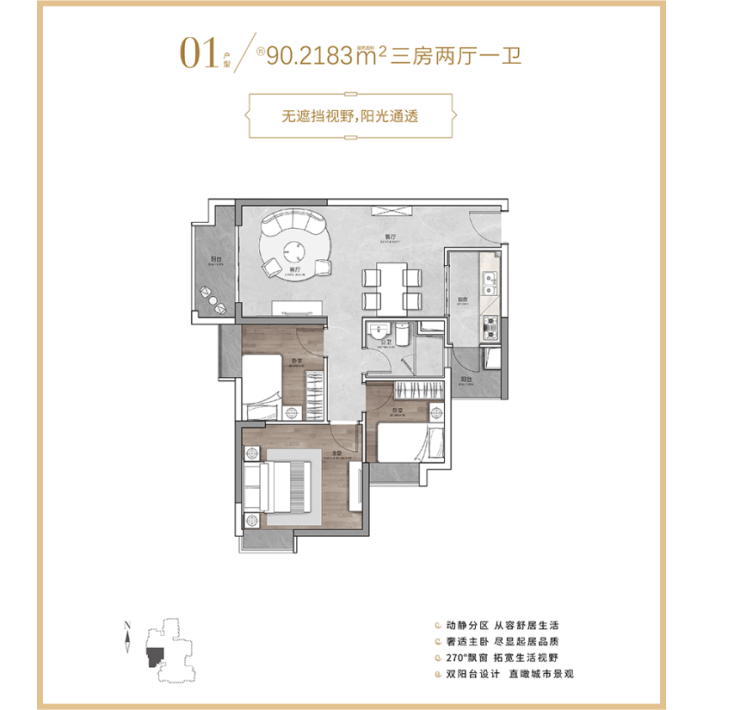 总价约328万元的90㎡三室两厅,是三口之家的理想选择。户型布局规整有序,厨房采用U型设计,操作空间充足,还预留了冰箱位置,贴合日常烹饪习惯。次卧面积刚好能放下儿童床,满足孩子的成长需求,公卫做了干湿分离设计,家人日常使用互不干扰,极大提升了生活效率。