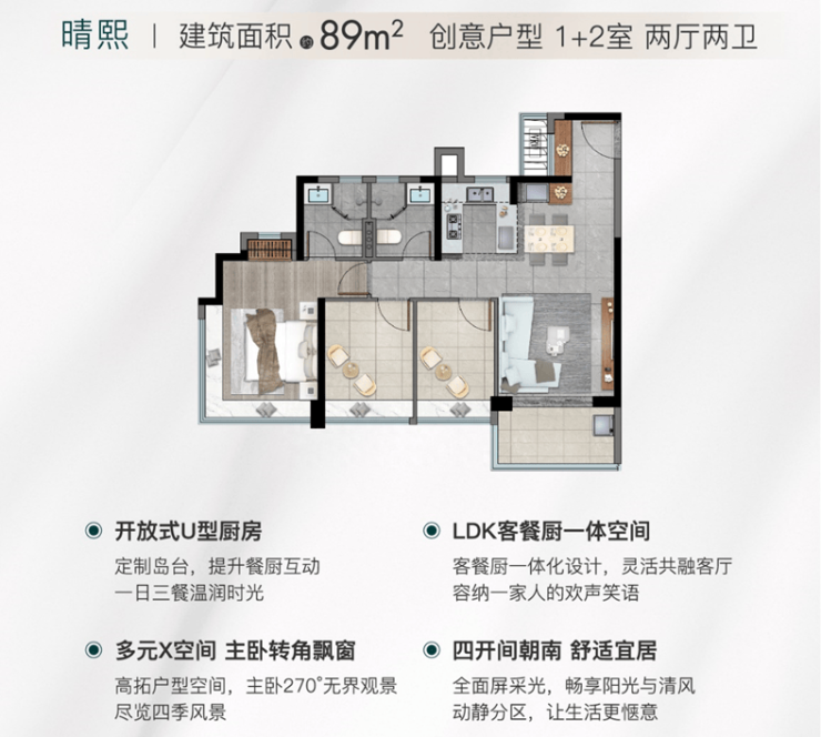 卓越晴翠府主力户型聚焦90–125平方米的三至四房产品,旨在满足城市中产家庭“一步到位”的改善需求。所有户型均采用动静分区、公私分离的布局原则,主卧套房配置独立卫浴与步入式衣帽区,次卧与书房灵活可变,适应家庭结构变化。以建面约105平方米的三房两厅两卫户型为例,其得房率约为78%,客厅面宽达3.8米,连接6.2米长阳台,实现LDK(客厅-餐厅-厨房)一体化通透格局;厨房预留中西厨结合空间,卫生间采用干湿三分离设计,提升使用效率。