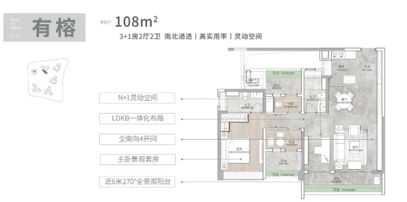 以建面约108平方米的户型为例,这款产品设计精巧,四开间朝南,拥有近6米的南向阳台,视野开阔,景观极佳。270度的转角景观窗,让室内外景色无缝衔接。LDKB(客餐厨阳台)一体化设计,打造出5.9米的大方厅,不仅增加了空间的通透感,也为家庭互动提供了宽敞的场所。主套设计奢阔,配置南向大飘窗、独立卫浴以及L型衣帽间,尽显尊贵与舒适。