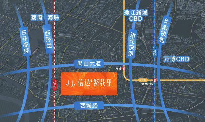 目前交通方面,步行约 1.7km 到市桥地铁站,距离稍远,需借助电鸡或公交接驳。不过通过 3 号线,不用换乘就能直达珠江新城、体育中心等 CBD 与商圈,还能 1 站到番禺广场,换乘 18/22 号线感受快速出行。而且规划中的 26 号线,网传或将设禺山大道站,未来有可能升级为地铁上盖。周边禺山大道、西环路等道路,自驾出行方便,可快速畅达荔湾、海珠、万博及珠江新城等区域。