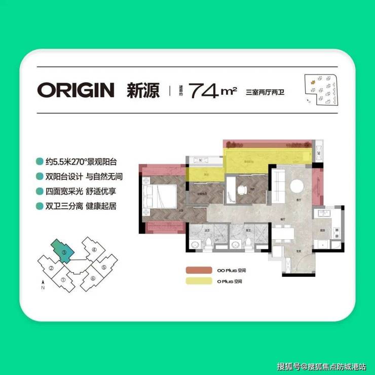 约82平方米 3房2厅2卫:6米大阳台,270°南望中轴园林,四开间朝南,全天沐浴阳光,主卧双飘窗,南北通透。