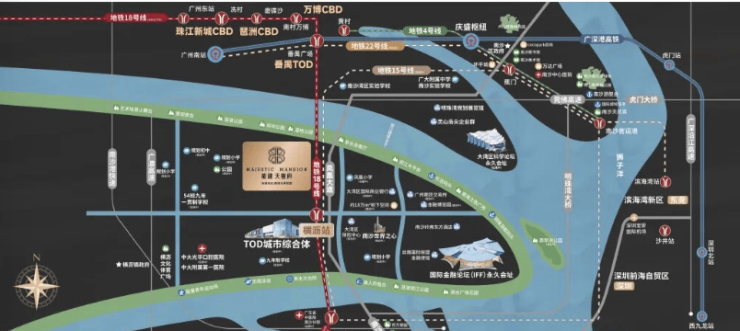 轨道交通方面,地铁 18 号线作为广州南北向快速地铁广州市人民政府,设计时速 160 公里广州市人民政府,是中国第一条时速 160 公里的全地下市域快线,站点覆盖南沙、番禺、海珠、天河四大核心区域。从横沥站出发,1 站直达番禺广场、2 站万博 CBD、3 站琶洲数字经济试验区、4 站珠江新城中央商务区,快车模式下全程仅需约 30 分钟广州市人民政府,完美满足在珠江新城、琶洲、万博上班的金融高管、企业主、科技精英通勤需求。同时,规划中的地铁 15 号线(南沙环线)、32 号线将在横沥站换乘,未来建成后可实现南沙内部地铁自由,进一步提升项目交通价值。