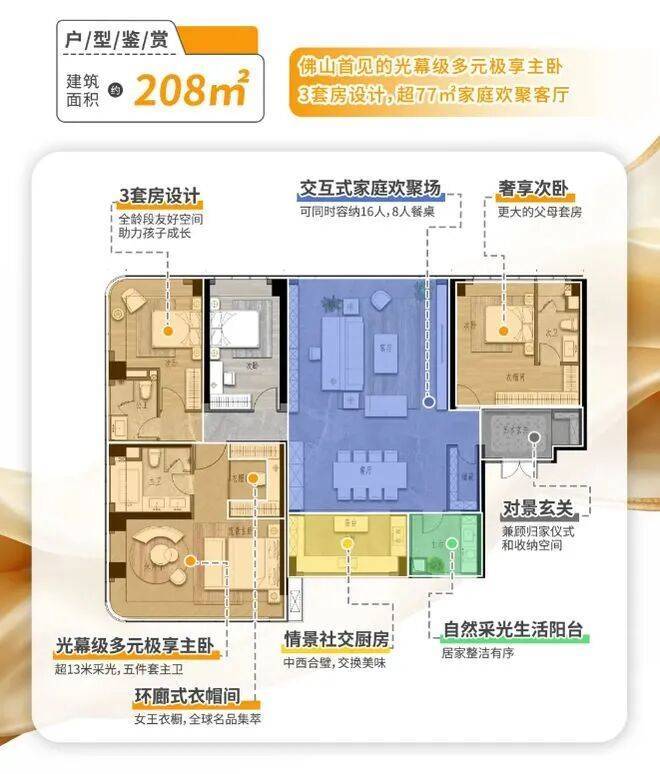 光幕级多元极享主卧:虽未详细描述与208㎡户型主卧采光面及面宽对比,但可推测同样具备良好采光与空间尺度优势,为居住者带来舒适体验。
