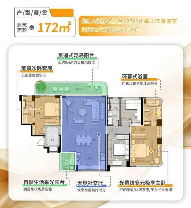 贯通式浮岛阳台:长约9.4米的阳台,从常规L型调整为无折角的连贯U型设计,实现超越广角的8k级环幕视野,让滨江盛景尽收眼底,同时保障极致隐私。