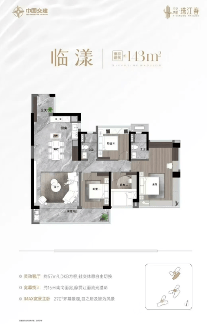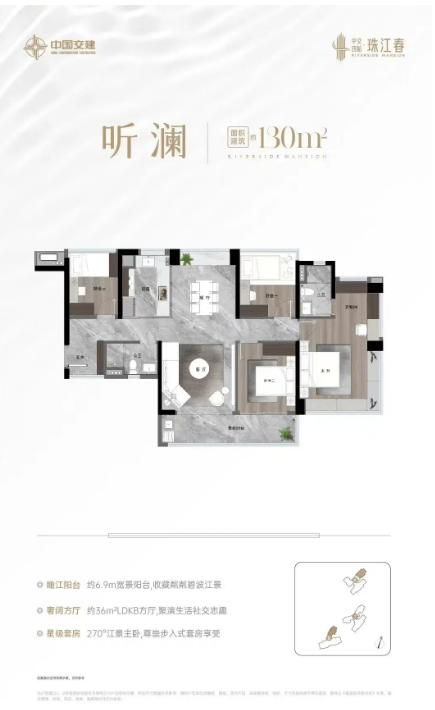 珠江春首推的6#、7#、8#栋户型面积主要为130-180平方米的大户型,所有户型均为全南向设计,确保每一户都能享受到最佳的采光效果和望江视野。为了实现景观最大化,每户都采用了大面积玻璃幕墙,开窗率最高可达68%,望江面宽达到15-18米,让江景成为每家每户的生活底色。