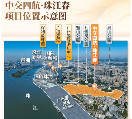 中交四航珠江春位于广州市老黄埔区的核心位置,紧邻珠江,距离最近的地铁鱼珠站仅几百米。该项目由世界500强企业中国交通建设股份有限公司旗下的中交第四航局开发,总建筑面积约90万平方米,集购物中心、总部办公、高端住宅、配建学校/幼儿园、康养中心、生态公园等多元业态于一体,是一个真正意义上的综合性大城。