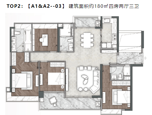具体户型方面,【A1&A2--01&02】120㎡三房两厅两卫,空间布局方正,客厅与景观阳台相连,山景视野无遮挡;主卧配备独立卫生间与飘窗,保障私密性与舒适度,适合三口之家的高端刚需或小型改善家庭。【A1&A2--03/04】180㎡四房两厅三卫,空间宽敞通透,四房设计满足多人口家庭需求,双主卧布局(均带独立卫生间),适合三代同堂或有客房需求的商务家庭;客厅开间阔绰,可打造高端社交空间,搭配大尺度景观阳台,山景与生活场景完美融合。