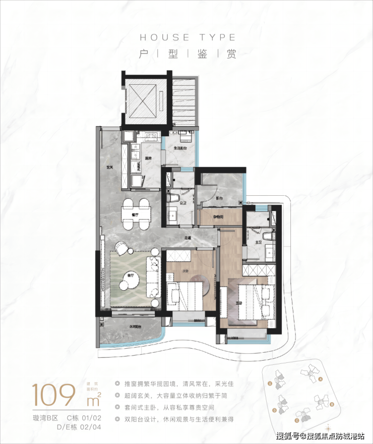 109㎡江景三房:总价470万起,三开间朝南,主卧套间带独立卫浴,玄关收纳空间达3.2㎡,实用率82%;