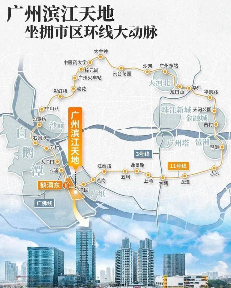 地铁11号线鹤洞东站:实测距离项目仅300米(2025年7月数据),2025年已通车,3站直达琶洲会展区,6站接驳珠江新城,通勤效率较传统路线提升50%。