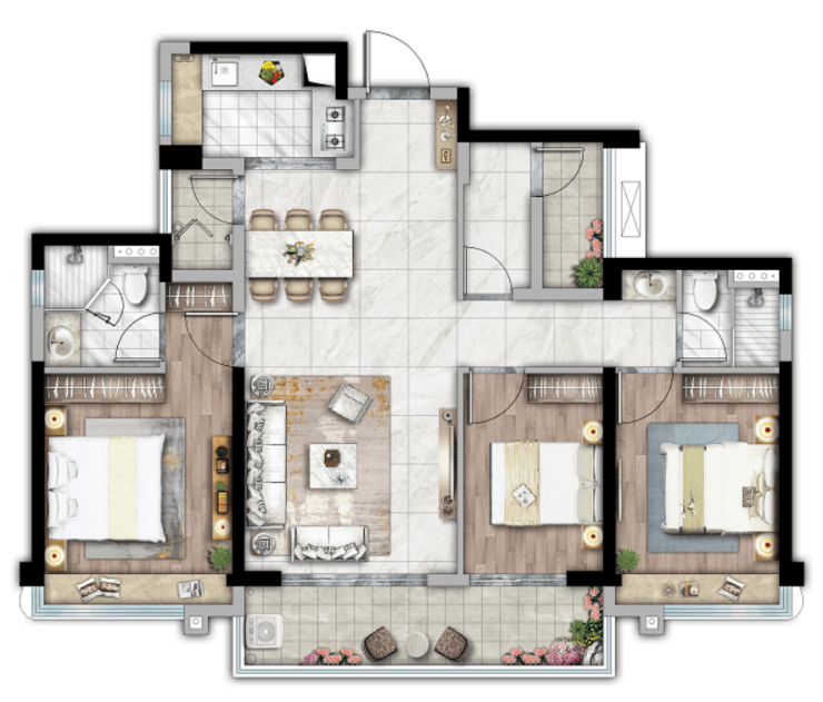 建面约107㎡ 四房两厅两卫:这是当前市场的主流改善户型。户型方正,动静分区明确。通常能做到南北通透,双阳台设计,客厅连接景观阳台,餐厅连接工作阳台,通风采光俱佳。主卧套房设计,带独立卫生间,私密性好。这个面积段做出四个房间,房间尺度控制得当,非常适合二胎家庭或需要预留老人房、书房的家庭。