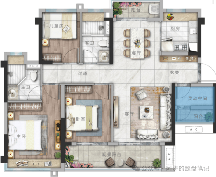 建面约142㎡ 四房两厅两卫:这是社区的标杆改善户型。通常拥有更大的面宽,带来更好的视野和采光。主卧套房可能配备衣帽间,尊崇感十足。客餐厅一体化设计,连接超大观景阳台,整个公共区域非常开阔,适合家庭聚会和接待客人。这个户型将舒适度和功能性都提升到了新的层次。