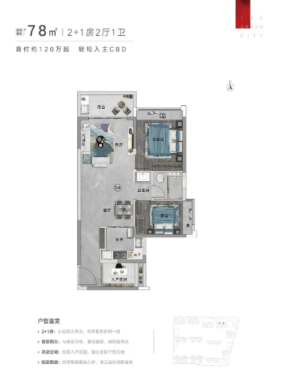 建面约78㎡2+1房,总价390万起:作为刚需上车优选户型,该户型采用三开间朝南设计,采光通风效果极佳。空间布局紧凑无浪费,2+1的灵动设计可根据需求打造为书房、儿童房或储物间,充分满足小家庭的居住需求。对于预算有限、追求高性价比的年轻购房者来说,这个户型既能实现“上车”广州第二CBD的梦想,又能保证居住的舒适度,是极具吸引力的选择。