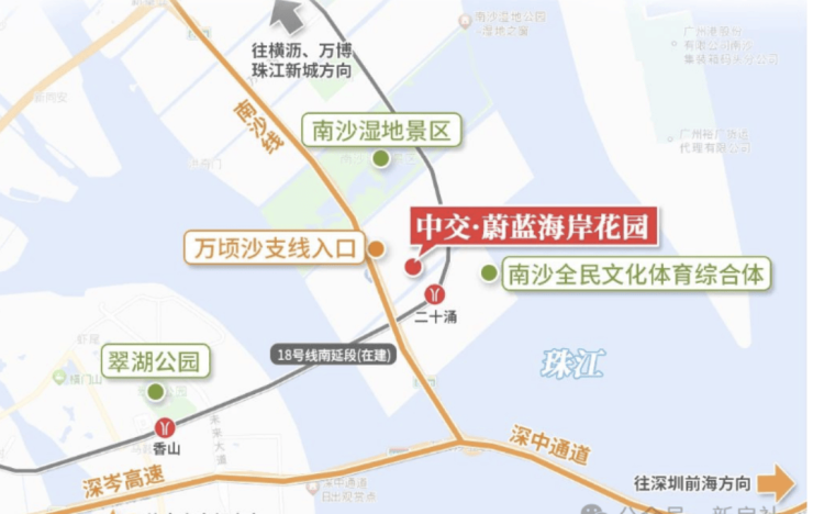 项目距离已通车的深中通道南沙线收费站约1公里,自驾半小时即可到达深圳前海。未来18号线南延线(南中城际)二十涌站约500米,设计时速高达160公里/小时,西线通达中山市区预计2027年通车,东线直达珠海拱北口岸预计2030年完成。此外,深南中城际也将在二十涌设站,未来将形成大湾区高效交通枢纽,实现广州、深圳、中山、珠海半小时通达。