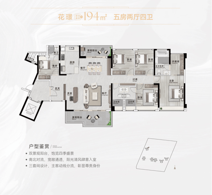 194㎡五房四卫:三间套房设计,32㎡主卧带衣帽间,双景观阳台,定义塔尖生活尺度。
