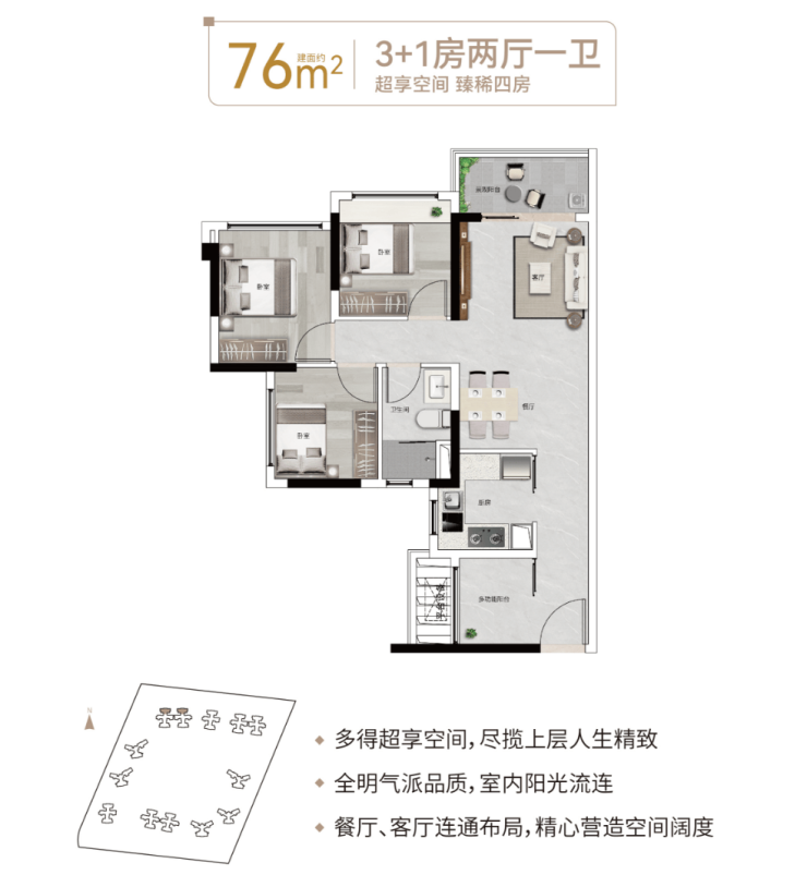 76㎡3+1房:低总价轻松上车天河,适合年轻首置家庭;