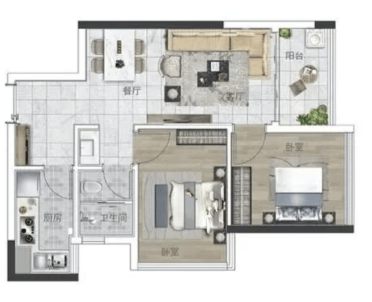 62-64㎡两房两厅一卫:紧凑实用,总价约300万起(适合新婚家庭或单身贵族)。