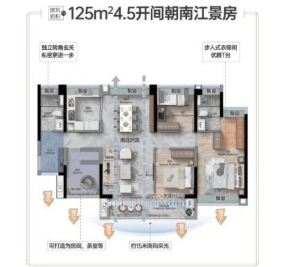 项目提供三种主要户型:建面约96平方米的竖厅户型,配有6.4米景观阳台和三开间朝南;建面约125平方米的王牌户型,具有4.5开间朝南和15米采光面,主次卧双南向设计;建面约140平方米的奢阔四房,拥有双阳台、16米南向面宽,衣帽间+套房主卧,满足不同家庭结构的需求。