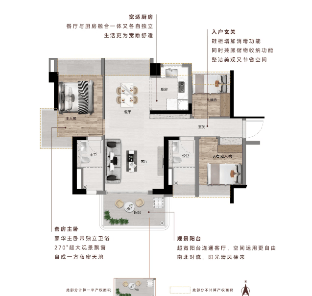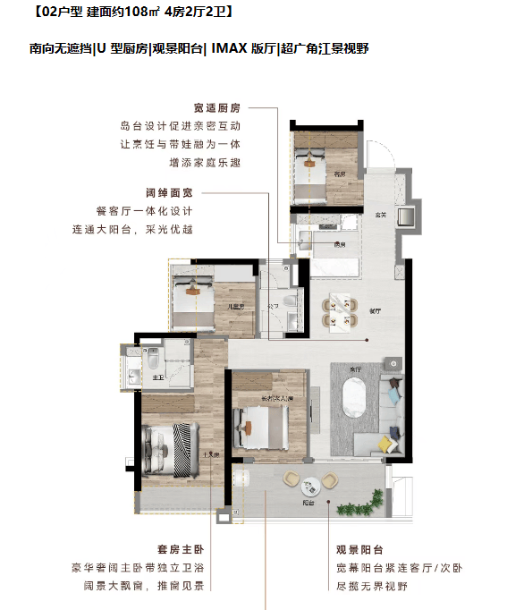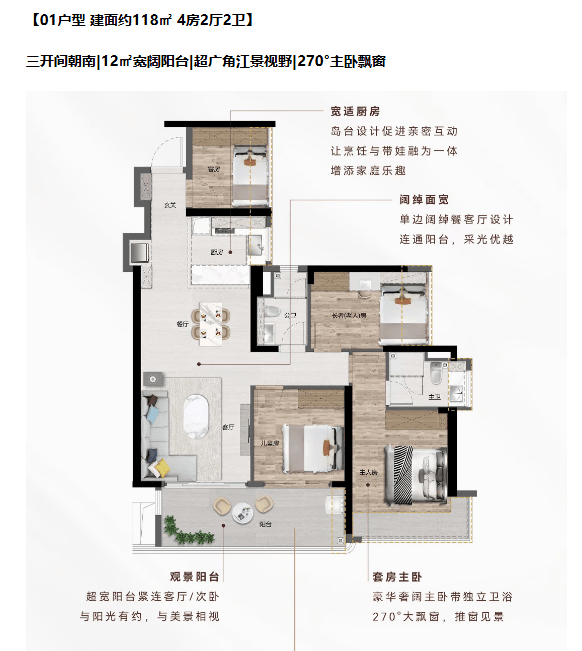 南北通透|主卧 270°飘窗+双飘窗|U 型厨房|南向观江景阳台