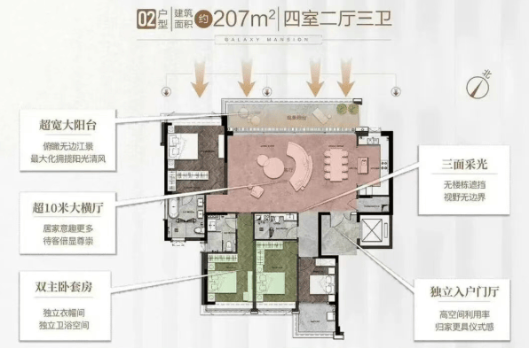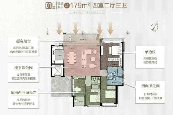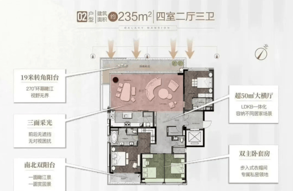 星河江缦摒弃了市场上常见的小户型混杂模式,全盘仅打造179㎡至235㎡四房三卫大平层产品,最小户型即为179㎡,确保社区客群的高度同质化与圈层纯粹性。所有楼栋均为2梯2户专梯专户设计,私密尊崇感不言而喻。户型采用LDKB(客厅、餐厅、厨房、阳台)一体化布局,空间通透开阔;双主卧套间配置,兼顾家庭成员的独立生活需求;高达84%的得房率,在当前市场普遍压缩实用面积的背景下尤为珍贵。