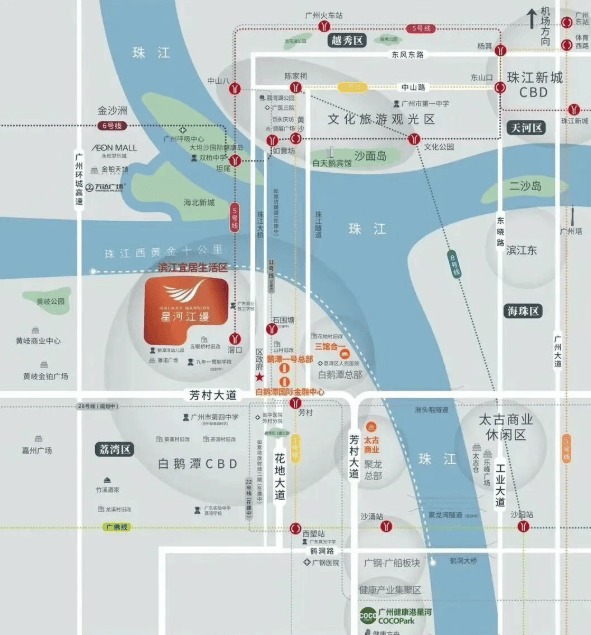 尽管地处广佛交界,但星河江缦所享有的城市配套却丝毫不逊于传统市中心。交通方面,项目距离地铁5号线滘口站约750米,步行即可抵达;自驾出行亦极为便捷,芳村大道、白鹅潭大道、如意坊隧道等主干道环伺,快速通达荔湾、海珠、越秀等核心城区。