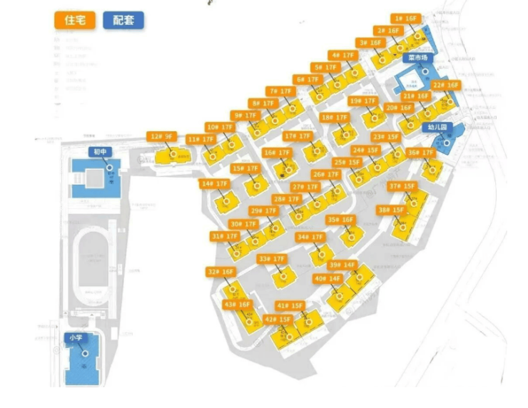 1. 整体规划:项目总占地面积约8.1万方,总建筑面积约37万方,规划42栋16-17层南北对流纯板式低密度小高层,容积率仅2.59,绿地率35%,全盘1270户,采用“低密度、宽楼间距”的规划理念,虽然受限于60米限高,楼栋数量较多,但通过科学的楼栋排布,最大限度保障每一户的采光与通风,同时提升社区的居住舒适度与私密性。