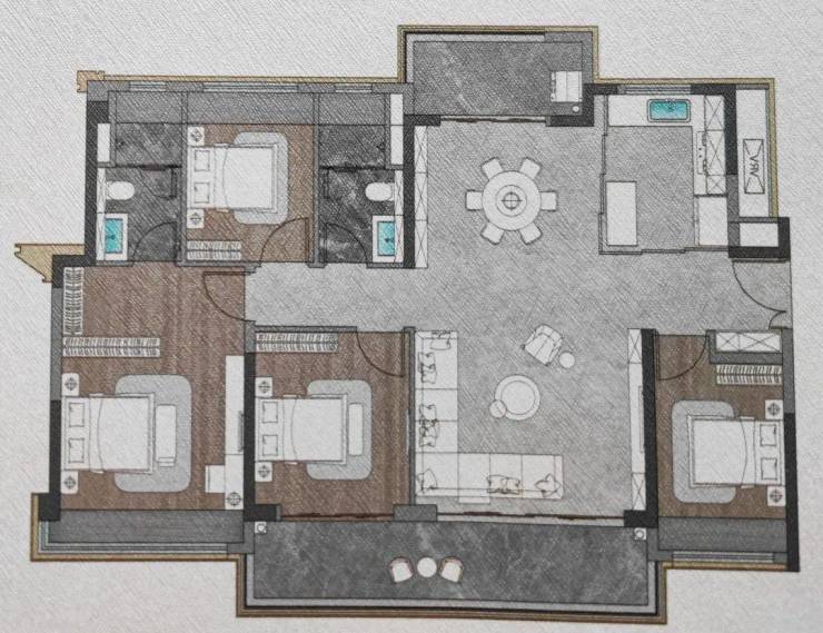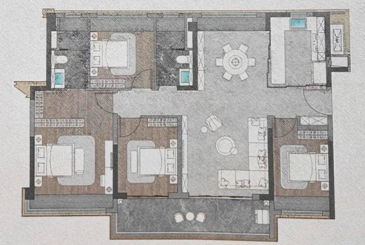 143㎡四房:布局与128㎡相似,但增加了南北双阳台的设计,提升了居住舒适度。