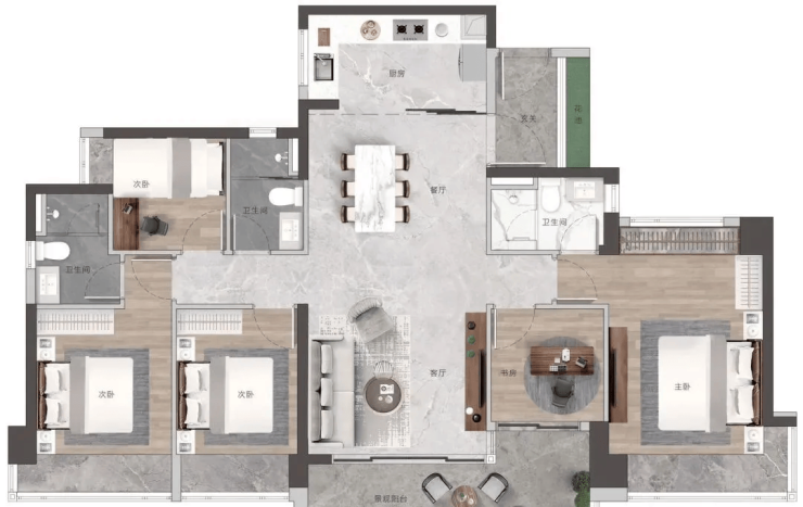 【143㎡五房两厅三卫】:定位高端改善户型,约3.3米墅级层高,可轻松装配中央空调,打造舒适奢宅体验。高配双主套三卫设计,书房可作为主卧延展空间,打造总统级套房,满足多代同堂家庭的居住需求。五开间全朝南布局,主卧与客厅双270°转角设计,实现全面屏无际美景观赏,推窗即揽山景与园景。净长约6.3米巨幕山景阳台,最大净进深约2.2米,提供沉浸式观景体验;宽敞客餐厅设计,搭配U型明厨与通透竖厅,可轻松容纳家庭欢聚。该户型实用率高达97%,带花池入户花园,全屋6大飘窗配置,兼顾实用性与奢华感。