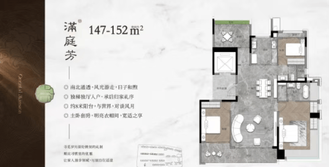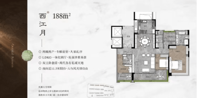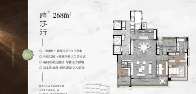 268平方米户型:作为旗舰户型,采用3T2户设计,拥有保姆电梯和独立的保姆房,保证了业主的私密性和舒适度。超大采光面让自然景观与室内空间完美融合,LDKG一体化大方厅设计提高了空间利用率,主卧配有步入式衣帽间和双台盆配置,提升了生活品质。