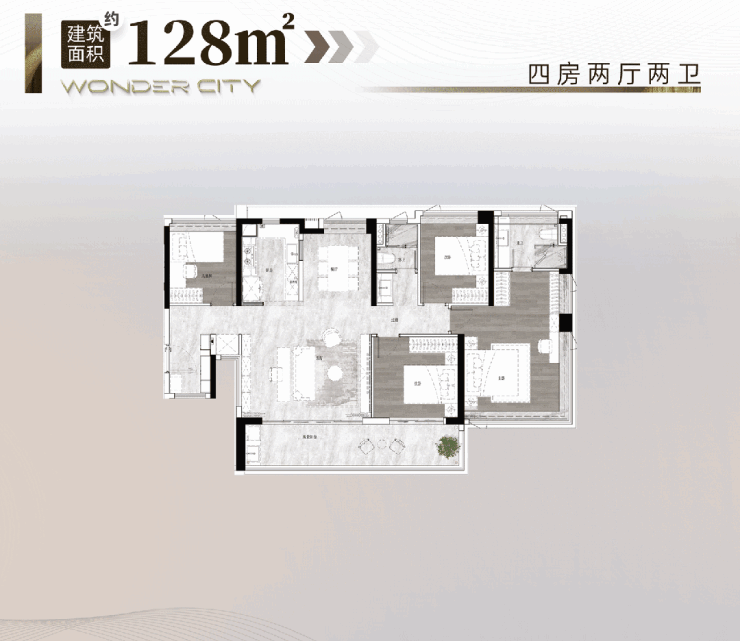 户型设计亮点满满,得房率 100 - 120% 。一期在售建面约 122 - 186 平南向阔景四房,南向超大面宽,巨幕阳台。二期建面约 105 平及 128 平四房,户户大面宽朝南,全屋空间均好性强,收纳系统丰富,飘窗拓展空间大。105 平户型客厅开间大,128 平户型南北对流,南向面宽惊人,阳台尺度大,每个户型都满足高品质居住需求。